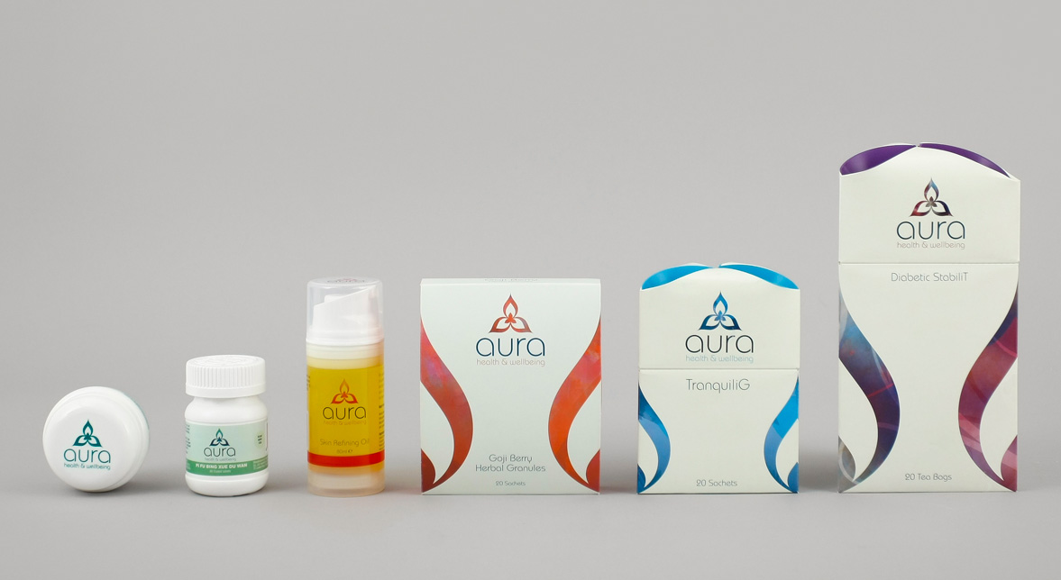 Aura is a range of herbal teas and medicinal remedies produced by Dr China. It's infusions are firmly rooted in traditional Chinese remedies but tailored towards a western market. The structural and graphic design language is intended to unite these worlds and to sit somewhere between a pharmaceutical and lifestyle product. For further information visit: